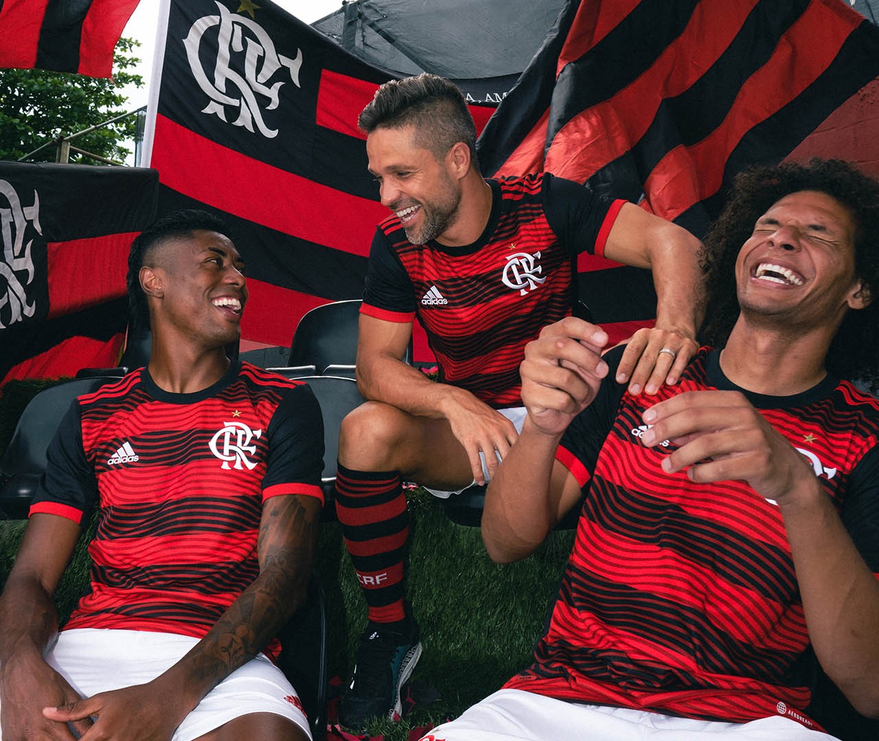Vista-se como um verdadeiro torcedor do Flamengo com a camisa da equipe rubro-negra, o manto da temporada 22/23 possui predominantemente as cores vermelha e preta.